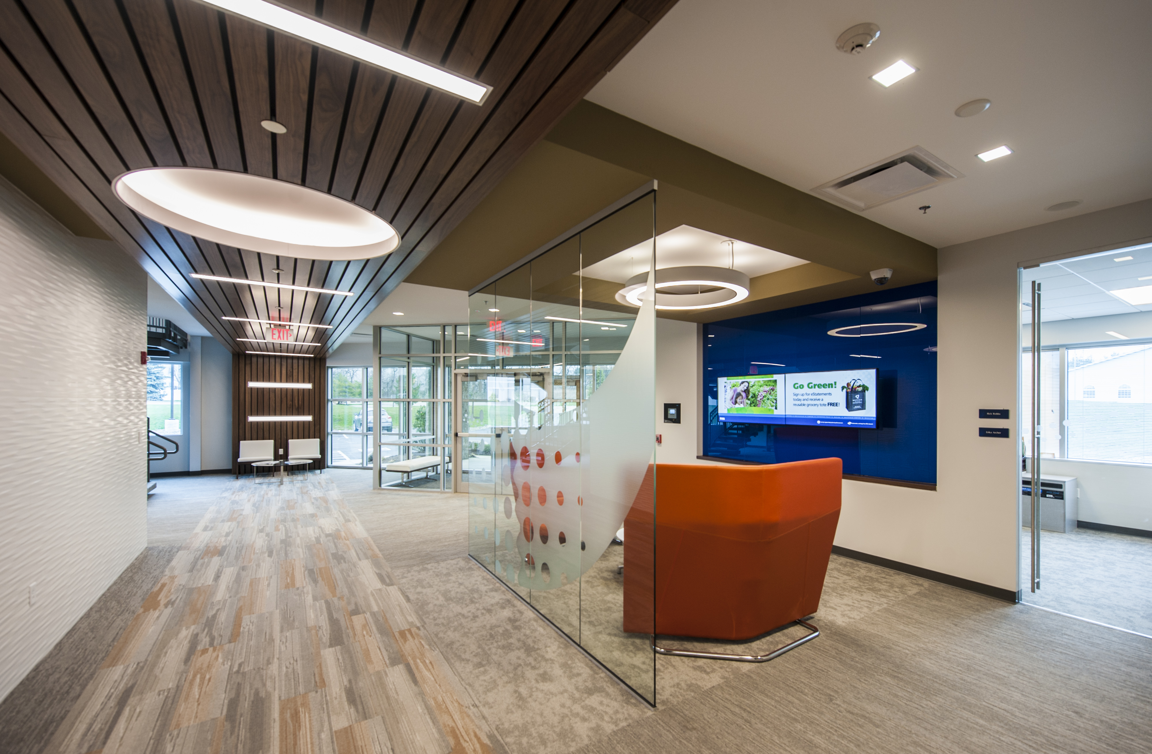 We listened to the Bank’s desires and developed a conceptual strategy to meet their expectations. Three key ideas of flexibility, natural light, and transparency drove the floor plan layouts and materials selections. The Bank wanted a mix of enclosed and open office workspaces that worked together in a cohesive way. We therefore incorporated glass walls and strategically designed the floor layouts to allow natural light to filter into all spaces and make otherwise opaque boundaries transparent.